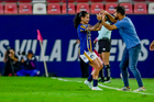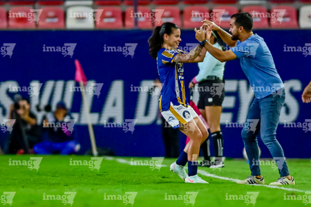 San Luis Potosí, San Luis Potosí, 12 de octubre de 2025. Ilana Izquierdo e Ignacio Quintana, director técnico, en festejo de gol, durante el partido correspondiente a la jornada 15 del torneo Apertura 2025 de la Liga BBVA MX Femenil, entre el Atlético San Luis y las Diablas Rojas del Toluca, realizado en el estadio Alfonso Lastras. Foto: Imago7/ Hugo Martinez
