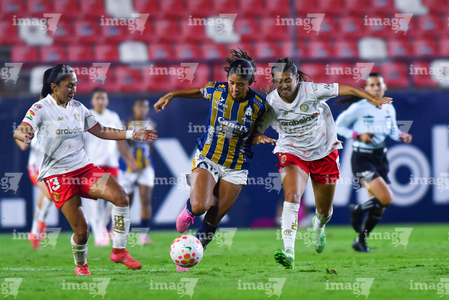 San Luis Potosí, San Luis Potosí, 12 de octubre de 2025. Enyerliannys Higuera, Amandine Henry y Faustine Robert, durante el partido correspondiente a la jornada 15 del torneo Apertura 2025 de la Liga BBVA MX Femenil, entre el Atlético San Luis y las Diablas Rojas del Toluca, realizado en el estadio Alfonso Lastras. Foto: Imago7/ Hugo Martinez