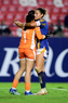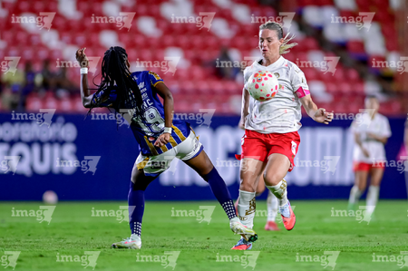 San Luis Potosí, San Luis Potosí, 12 de octubre de 2025. Aidin López y Shanice Van De Sanden, durante el partido correspondiente a la jornada 15 del torneo Apertura 2025 de la Liga BBVA MX Femenil, entre el Atlético San Luis y las Diablas Rojas del Toluca, realizado en el estadio Alfonso Lastras. Foto: Imago7/ Hugo Martinez