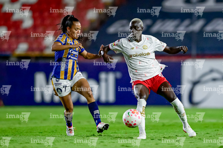 San Luis Potosí, San Luis Potosí, 12 de octubre de 2025. Viridiana López y Michaela Abam, durante el partido correspondiente a la jornada 15 del torneo Apertura 2025 de la Liga BBVA MX Femenil, entre el Atlético San Luis y las Diablas Rojas del Toluca, realizado en el estadio Alfonso Lastras. Foto: Imago7/ Hugo Martinez