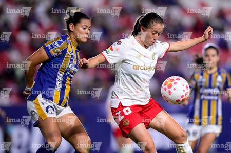 San Luis Potosí, San Luis Potosí, 12 de octubre de 2025. Valerie Cortez y Wendy Natis, durante el partido correspondiente a la jornada 15 del torneo Apertura 2025 de la Liga BBVA MX Femenil, entre el Atlético San Luis y las Diablas Rojas del Toluca, realizado en el estadio Alfonso Lastras. Foto: Imago7/ Olimpia Puga
