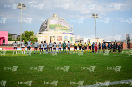 Querétaro, Querétaro, 15 de octubre de 2025. Protocolo, durante el partido correspondiente a la jornada 16 del torneo Apertura 2025 de la Liga BBVA MX Femenil, entre el Club Querétaro y la Máquina Celeste del Cruz Azul, realizado en el estadio Olímpico Alameda. Foto: Imago7/ Alexis Chavez