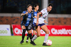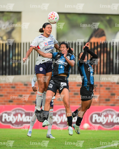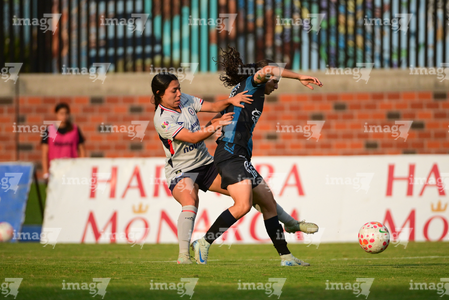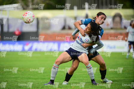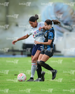 Querétaro, Querétaro, 15 de octubre de 2025. Aerial Chavarin y Lady Andrade, durante el partido correspondiente a la jornada 16 del torneo Apertura 2025 de la Liga BBVA MX Femenil, entre el Club Querétaro y la Máquina Celeste del Cruz Azul, realizado en el estadio Olímpico Alameda. Foto: Imago7/ Alexis Chavez