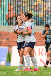 Querétaro, Querétaro, 15 de octubre de 2025. Valeria Valdez y Fabiola Santamaria, durante el partido correspondiente a la jornada 16 del torneo Apertura 2025 de la Liga BBVA MX Femenil, entre el Club Querétaro y la Máquina Celeste del Cruz Azul, realizado en el estadio Olímpico Alameda. Foto: Imago7/ Alexis Chavez