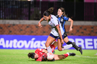 Querétaro, Querétaro, 15 de octubre de 2025. Marta Alemany y Aerial Chavarin, durante el partido correspondiente a la jornada 16 del torneo Apertura 2025 de la Liga BBVA MX Femenil, entre el Club Querétaro y la Máquina Celeste del Cruz Azul, realizado en el estadio Olímpico Alameda. Foto: Imago7/ Alexis Chavez