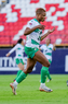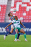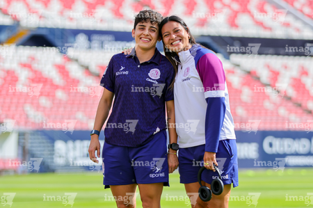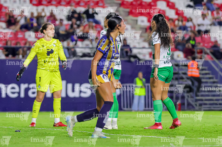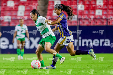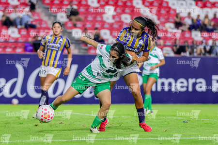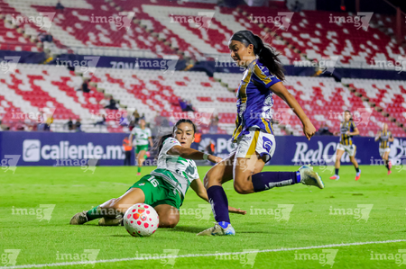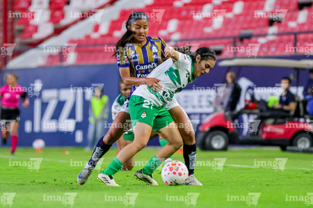 San Luis Potosí, San Luis Potosí, 1 de noviembre de 2025. Judith Felix y Mia Flores, durante el partido correspondiente a la jornada 17 del torneo Apertura 2025 de la Liga BBVA MX Femenil, entre el Atlético San Luis y las Guerreras de Santos Laguna, realizado en el estadio Alfonso Lastras. Foto: Imago7/ Hugo Martinez