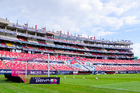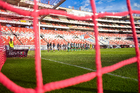San Luis Potosí, San Luis Potosí, 1 de noviembre de 2025. Red de portería de la Campaña Rosa para la concientización del Cáncer de Mama, durante el partido correspondiente a la jornada 17 del torneo Apertura 2025 de la Liga BBVA MX Femenil, entre el Atlético San Luis y las Guerreras de Santos Laguna, realizado en el estadio Alfonso Lastras. Foto: Imago7/ Hugo Martinez