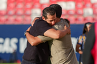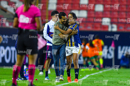 San Luis Potosí, San Luis Potosí, 1 de noviembre de 2025. Ignacio Quintana, director técnico y Citlali Hernández en festejo de gol, durante el partido correspondiente a la jornada 17 del torneo Apertura 2025 de la Liga BBVA MX Femenil, entre el Atlético San Luis y las Guerreras de Santos Laguna, realizado en el estadio Alfonso Lastras. Foto: Imago7/ Olimpia Puga