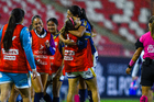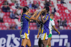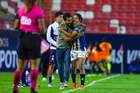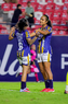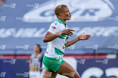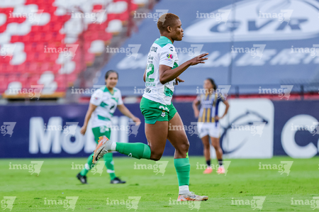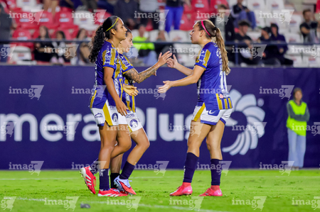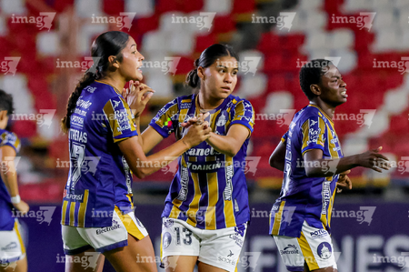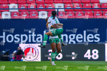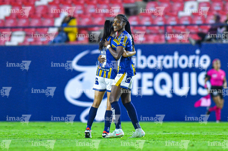 San Luis Potosí, San Luis Potosí, 1 de noviembre de 2025. Farlyn Caicedo (D) en festejo, durante el partido correspondiente a la jornada 17 del torneo Apertura 2025 de la Liga BBVA MX Femenil, entre el Atlético San Luis y las Guerreras de Santos Laguna, realizado en el estadio Alfonso Lastras. Foto: Imago7/ Olimpia Puga