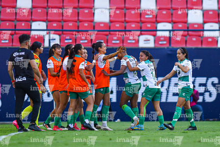San Luis Potosí, San Luis Potosí, 1 de noviembre de 2025. Jugadoras de Santos femenil en festejo de gol, durante el partido correspondiente a la jornada 17 del torneo Apertura 2025 de la Liga BBVA MX Femenil, entre el Atlético San Luis y las Guerreras de Santos Laguna, realizado en el estadio Alfonso Lastras. Foto: Imago7/ Olimpia Puga