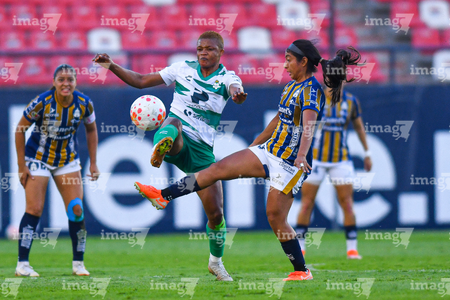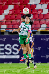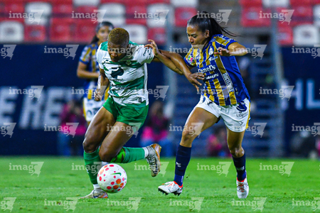 San Luis Potosí, San Luis Potosí, 1 de noviembre de 2025. Judith Felix y Aidin López, durante el partido correspondiente a la jornada 17 del torneo Apertura 2025 de la Liga BBVA MX Femenil, entre el Atlético San Luis y las Guerreras de Santos Laguna, realizado en el estadio Alfonso Lastras. Foto: Imago7/ Hugo Martinez