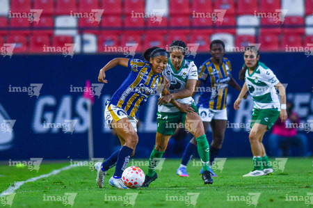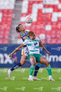 San Luis Potosí, San Luis Potosí, 1 de noviembre de 2025. Aidin López y Judith Felix, durante el partido correspondiente a la jornada 17 del torneo Apertura 2025 de la Liga BBVA MX Femenil, entre el Atlético San Luis y las Guerreras de Santos Laguna, realizado en el estadio Alfonso Lastras. Foto: Imago7/ Hugo Martinez
