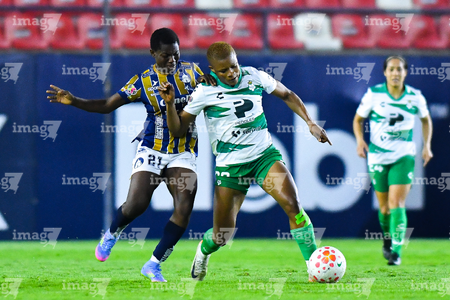San Luis Potosí, San Luis Potosí, 1 de noviembre de 2025. Elaily Hernández-Repreza y Vivian Ikechukwu , durante el partido correspondiente a la jornada 17 del torneo Apertura 2025 de la Liga BBVA MX Femenil, entre el Atlético San Luis y las Guerreras de Santos Laguna, realizado en el estadio Alfonso Lastras. Foto: Imago7/ Hugo Martinez