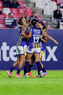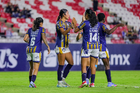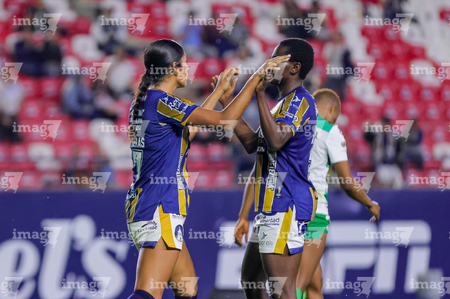 San Luis Potosí, San Luis Potosí, 1 de noviembre de 2025. Vivian Ikechukwu y Dania Padilla en festejo de gol, durante el partido correspondiente a la jornada 17 del torneo Apertura 2025 de la Liga BBVA MX Femenil, entre el Atlético San Luis y las Guerreras de Santos Laguna, realizado en el estadio Alfonso Lastras. Foto: Imago7/ Olimpia Puga