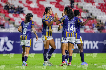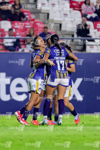 San Luis Potosí, San Luis Potosí, 1 de noviembre de 2025. Jugadoras del Atlético de San Luis femenil en festejo de gol, durante el partido correspondiente a la jornada 17 del torneo Apertura 2025 de la Liga BBVA MX Femenil, entre el Atlético San Luis y las Guerreras de Santos Laguna, realizado en el estadio Alfonso Lastras. Foto: Imago7/ Hugo Martinez