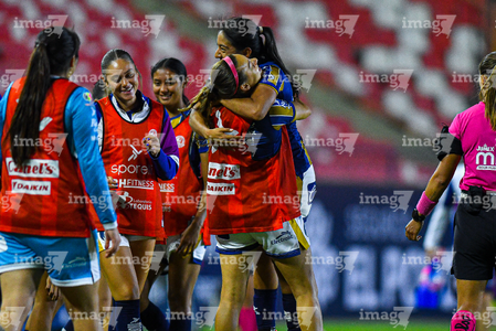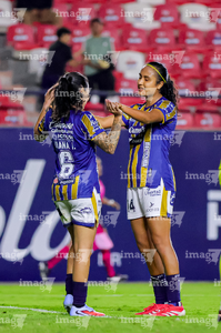 San Luis Potosí, San Luis Potosí, 1 de noviembre de 2025. Rebeca Contreras y Aurora Suárez en festejo de gol, durante el partido correspondiente a la jornada 17 del torneo Apertura 2025 de la Liga BBVA MX Femenil, entre el Atlético San Luis y las Guerreras de Santos Laguna, realizado en el estadio Alfonso Lastras. Foto: Imago7/ Hugo Martinez