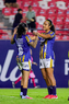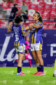 San Luis Potosí, San Luis Potosí, 1 de noviembre de 2025. Ilana Izquierdo e Isabel Kasis en festejo de gol, durante el partido correspondiente a la jornada 17 del torneo Apertura 2025 de la Liga BBVA MX Femenil, entre el Atlético San Luis y las Guerreras de Santos Laguna, realizado en el estadio Alfonso Lastras. Foto: Imago7/ Hugo Martinez