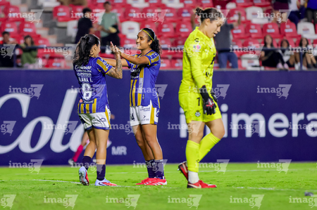 San Luis Potosí, San Luis Potosí, 1 de noviembre de 2025. Ilana Izquierdo y Mia Flores en festejo de gol, durante el partido correspondiente a la jornada 17 del torneo Apertura 2025 de la Liga BBVA MX Femenil, entre el Atlético San Luis y las Guerreras de Santos Laguna, realizado en el estadio Alfonso Lastras. Foto: Imago7/ Hugo Martinez