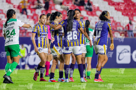 San Luis Potosí, San Luis Potosí, 1 de noviembre de 2025. Jugadoras del Atlético de San Luis femenil, durante el partido correspondiente a la jornada 17 del torneo Apertura 2025 de la Liga BBVA MX Femenil, entre el Atlético San Luis y las Guerreras de Santos Laguna, realizado en el estadio Alfonso Lastras. Foto: Imago7/ Hugo Martinez