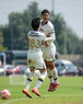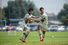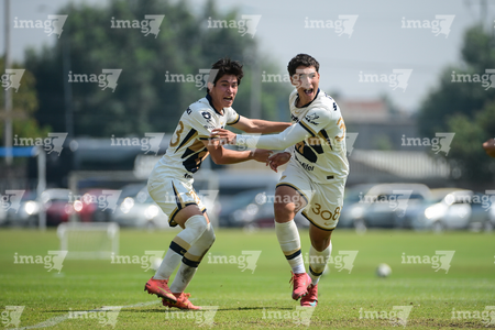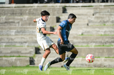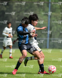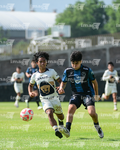 Ciudad de México, 1 de noviembre de 2025. Armando Braña y Luis Gordillo, durante el partido correspondiente a la jornada 17 del torneo Apertura 2025 de la Liga BBVA MX categoría Sub17, entre los Pumas de la UNAM y los Gallos Blancos del Querétaro, realizado en Cantera. Foto: Imago7/ Alexis Chavez
