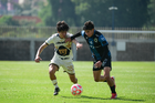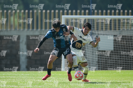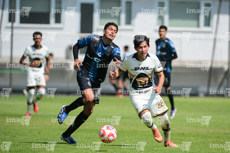 Ciudad de México, 1 de noviembre de 2025. Cristiano Silva y Jorge Moran, durante el partido correspondiente a la jornada 17 del torneo Apertura 2025 de la Liga BBVA MX categoría Sub17, entre los Pumas de la UNAM y los Gallos Blancos del Querétaro, realizado en Cantera. Foto: Imago7/ Alexis Chavez
