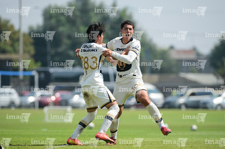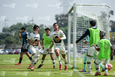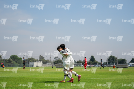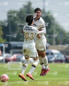 Ciudad de México, 1 de noviembre de 2025. Jaime Obregón en festejo de gol, durante el partido correspondiente a la jornada 17 del torneo Apertura 2025 de la Liga BBVA MX categoría Sub17, entre los Pumas de la UNAM y los Gallos Blancos del Querétaro, realizado en Cantera. Foto: Imago7/ Alexis Chavez