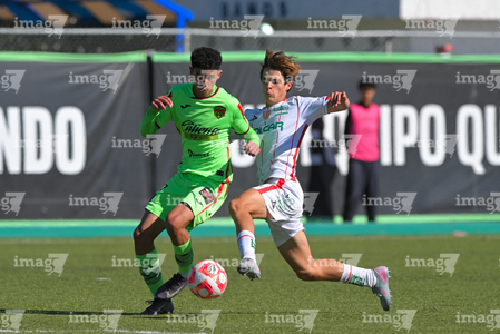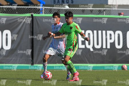 Ciudad Juárez, Chihuahua, 1 de noviembre de 2025. Axel Acosta y Nicolás Amozurrutia, durante el partido correspondiente a la jornada 17 del torneo Apertura 2025 de la Liga BBVA MX categoría Sub17, entre los Bravos de FC Juárez y los Rayos del Necaxa, realizado en realizado en el Complejo Deportivo Bravos. Foto: Imago7/ José Zamora