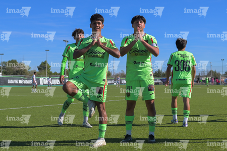Ciudad Juárez, Chihuahua, 1 de noviembre de 2025. Alan Siqueiros y Vieri Moreno en festejo, durante el partido correspondiente a la jornada 17 del torneo Apertura 2025 de la Liga BBVA MX categoría Sub17, entre los Bravos de FC Juárez y los Rayos del Necaxa, realizado en realizado en el Complejo Deportivo Bravos. Foto: Imago7/ José Zamora