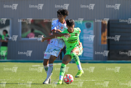 Ciudad Juárez, Chihuahua, 1 de noviembre de 2025. Leonardo Arvizo y Alejando González, durante el partido correspondiente a la jornada 17 del torneo Apertura 2025 de la Liga BBVA MX categoría Sub17, entre los Bravos de FC Juárez y los Rayos del Necaxa, realizado en realizado en el Complejo Deportivo Bravos. Foto: Imago7/ José Zamora