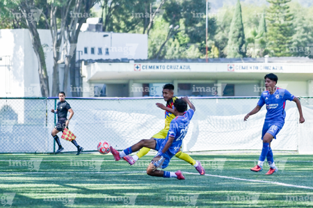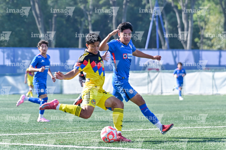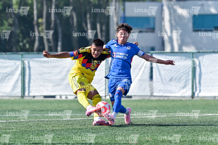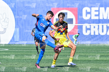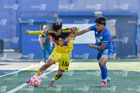 Ciudad de México, 1 de noviembre de 2025. Nicolás Aguilar y Mauricio Ramírez, durante el partido correspondiente a la jornada 17 del torneo Apertura 2025 de la Liga BBVA MX categoría Sub 17, entre La Máquina Celeste de la Cruz Azul y las Águilas del América, realizado en el La Noria. Foto: Imago7/ Mauricio Ruiz