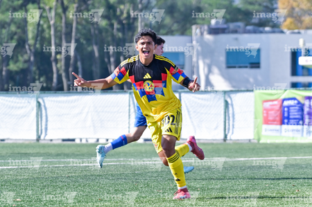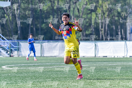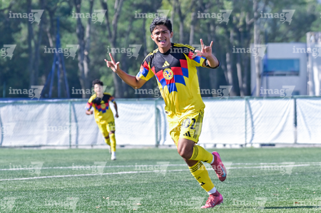 Ciudad de México, 1 de noviembre de 2025. Juan Rangel en festejo de gol, durante el partido correspondiente a la jornada 17 del torneo Apertura 2025 de la Liga BBVA MX categoría Sub17, entre la Máquina Celeste del Cruz Azul y las Águilas del América, realizado en La Noria. Foto: Foto: Imago7 / Mauricio Ruíz