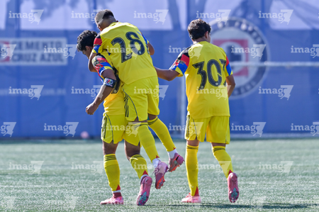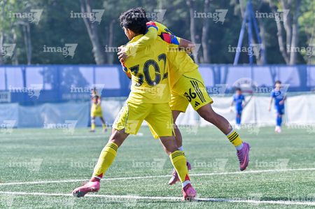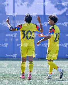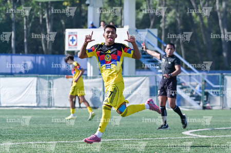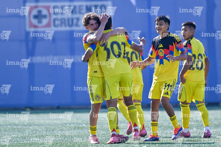 Ciudad de México, 1 de noviembre de 2025. Jugadores del América en festejo de gol, durante el partido correspondiente a la jornada 17 del torneo Apertura 2025 de la Liga BBVA MX categoría Sub 17, entre La Máquina Celeste de la Cruz Azul y las Águilas del América, realizado en el La Noria. Foto: Imago7/ Mauricio Ruiz