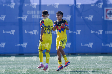 Ciudad de México, 1 de noviembre de 2025. Juan Portillo y Santiago López, durante el partido correspondiente a la jornada 17 del torneo Apertura 2025 de la Liga BBVA MX categoría Sub 17, entre La Máquina Celeste de la Cruz Azul y las Águilas del América, realizado en el La Noria. Foto: Imago7/ Mauricio Ruiz