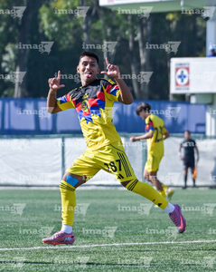 Ciudad de México, 1 de noviembre de 2025. Omar Vázquez en festejo de gol, durante el partido correspondiente a la jornada 17 del torneo Apertura 2025 de la Liga BBVA MX categoría Sub 17, entre La Máquina Celeste de la Cruz Azul y las Águilas del América, realizado en el La Noria. Foto: Imago7/ Mauricio Ruiz