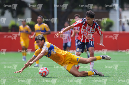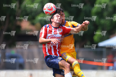 Zapopan, Jalisco, 17 de septiembre de 2025. José Elenes (I) y Kevin Acevedo (D), durante el partido correspondiente a la jornada 1 del torneo Apertura 2025 de la Liga BBVA MX categoría Sub19, entre las Chivas Rayadas del Guadalajara y los Tigres de la UANL, realizado en la Cancha Gigantera 2. Foto: Imago7/ Juan Carlos Cubeyro.