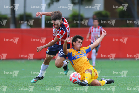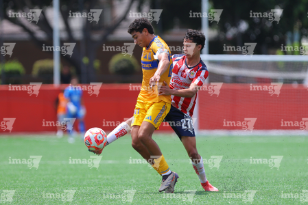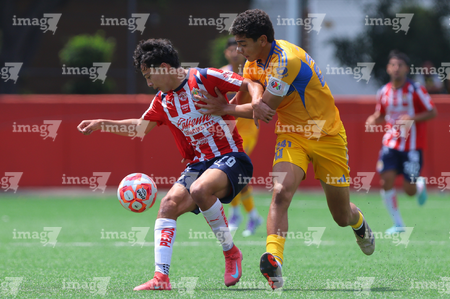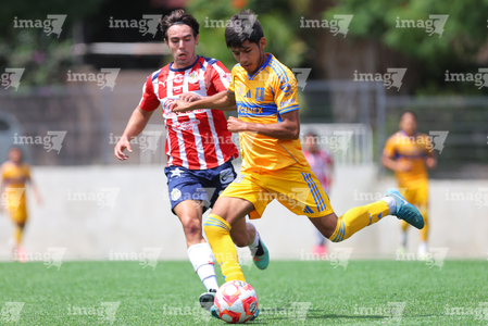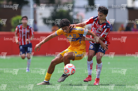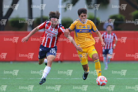 Zapopan, Jalisco, 17 de septiembre de 2025. Esteban Mendoza (I) y Jonathan Noriega (D), durante el partido correspondiente a la jornada 1 del torneo Apertura 2025 de la Liga BBVA MX categoría Sub19, entre las Chivas Rayadas del Guadalajara y los Tigres de la UANL, realizado en la Cancha Gigantera 2. Foto: Imago7/ Juan Carlos Cubeyro.
