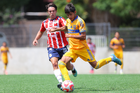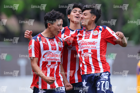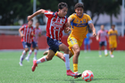 Zapopan, Jalisco, 17 de septiembre de 2025. Esteban Mendoza (D) anota gol, durante el partido correspondiente a la jornada 1 del torneo Apertura 2025 de la Liga BBVA MX categoría Sub19, entre las Chivas Rayadas del Guadalajara y los Tigres de la UANL, realizado en la Cancha Gigantera 2. Foto: Imago7/ Juan Carlos Cubeyro.