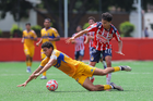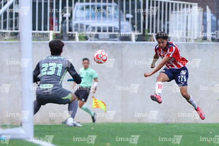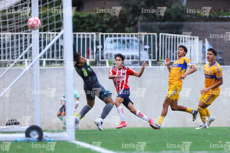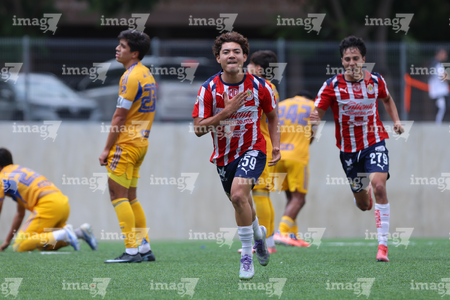 Zapopan, Jalisco, 17 de septiembre de 2025. Esteban Mendoza anota gol, durante el partido correspondiente a la jornada 1 del torneo Apertura 2025 de la Liga BBVA MX categoría Sub19, entre las Chivas Rayadas del Guadalajara y los Tigres de la UANL, realizado en la Cancha Gigantera 2. Foto: Imago7/ Juan Carlos Cubeyro.