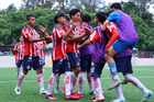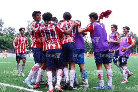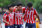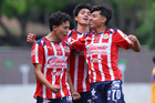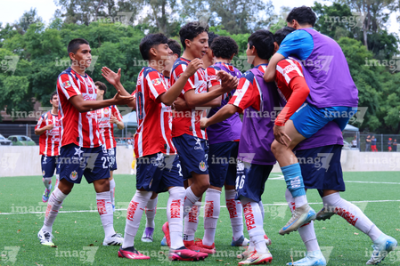 Zapopan, Jalisco, 17 de septiembre de 2025. Jugadores de Chivas en festejo de gol, durante el partido correspondiente a la jornada 1 del torneo Apertura 2025 de la Liga BBVA MX categoría Sub19, entre las Chivas Rayadas del Guadalajara y los Tigres de la UANL, realizado en la Cancha Gigantera 2. Foto: Imago7/ Juan Carlos Cubeyro.