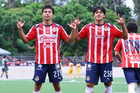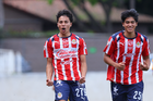 Zapopan, Jalisco, 17 de septiembre de 2025. Esteban Mendoza (I) y Leonel Clderón (D) en festejo de gol, durante el partido correspondiente a la jornada 1 del torneo Apertura 2025 de la Liga BBVA MX categoría Sub19, entre las Chivas Rayadas del Guadalajara y los Tigres de la UANL, realizado en la Cancha Gigantera 2. Foto: Imago7/ Juan Carlos Cubeyro.