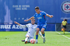 Ciudad de México, 24 de septiembre de 2025. Claudio Robles y Cristian Vázquez, durante el partido correspondiente a la jornada 10 del torneo Apertura 2025 de la Liga BBVA MX categoría Sub19, entre la Máquina Celeste del Cruz Azul y los Gallos Blancos del Querétaro, realizado en La Noria. Foto: Imago7/ Mauricio Ruiz