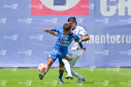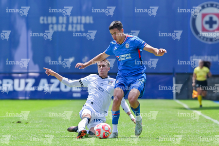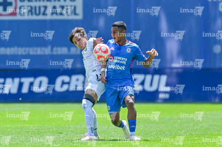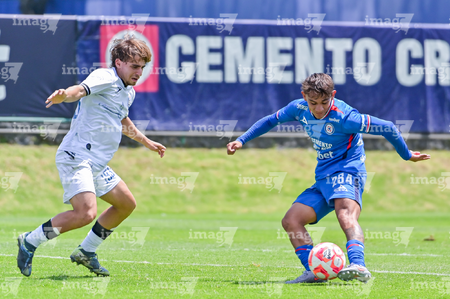 Ciudad de México, 24 de septiembre de 2025. José Sánchez y Humberto Montañez, durante el partido correspondiente a la jornada 10 del torneo Apertura 2025 de la Liga BBVA MX categoría Sub19, entre la Máquina Celeste del Cruz Azul y los Gallos Blancos del Querétaro, realizado en La Noria. Foto: Imago7/ Mauricio Ruiz
