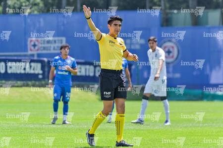 Ciudad de México, 24 de septiembre de 2025. Jonatan Abdiel Romero Olivares, árbitro central, durante el partido correspondiente a la jornada 10 del torneo Apertura 2025 de la Liga BBVA MX categoría Sub19, entre la Máquina Celeste del Cruz Azul y los Gallos Blancos del Querétaro, realizado en La Noria. Foto: Imago7/ Mauricio Ruiz
