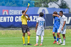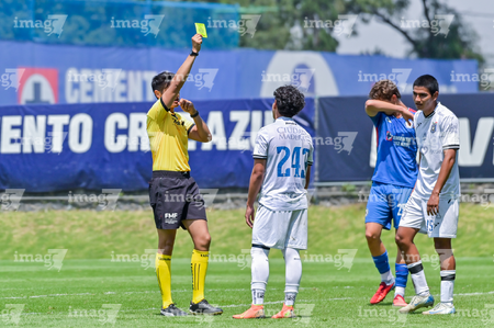 Ciudad de México, 24 de septiembre de 2025. Jonatan Abdiel Romero Olivares, árbitro central muestra tarjeta amarilla de amonestación para Rubén Segura, durante el partido correspondiente a la jornada 10 del torneo Apertura 2025 de la Liga BBVA MX categoría Sub19, entre la Máquina Celeste del Cruz Azul y los Gallos Blancos del Querétaro, realizado en La Noria. Foto: Imago7/ Mauricio Ruiz