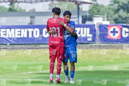Ciudad de México, 24 de septiembre de 2025. José Sánchez y Juan Barriga en festejo, durante el partido correspondiente a la jornada 10 del torneo Apertura 2025 de la Liga BBVA MX categoría Sub19, entre la Máquina Celeste del Cruz Azul y los Gallos Blancos del Querétaro, realizado en La Noria. Foto: Imago7/ Mauricio Ruiz