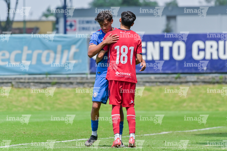 Ciudad de México, 24 de septiembre de 2025. Claudio Robles y Iker Pulido, durante el partido correspondiente a la jornada 10 del torneo Apertura 2025 de la Liga BBVA MX categoría Sub19, entre la Máquina Celeste del Cruz Azul y los Gallos Blancos del Querétaro, realizado en La Noria. Foto: Imago7/ Mauricio Ruiz