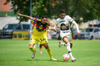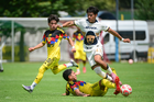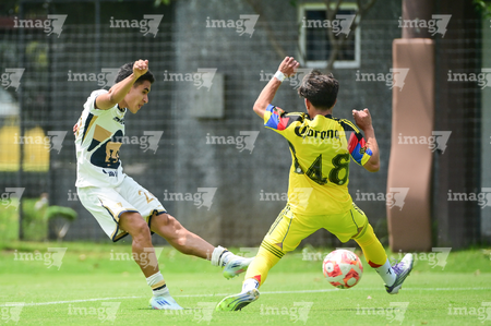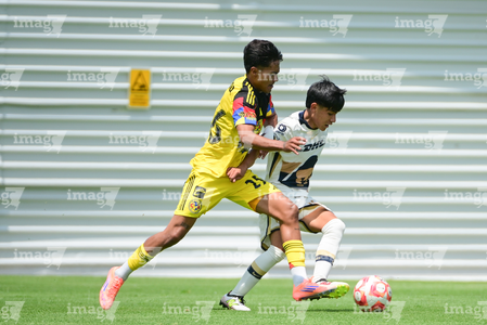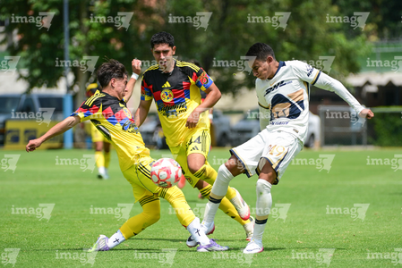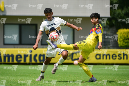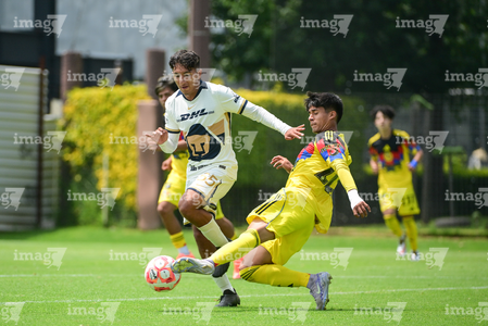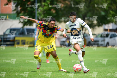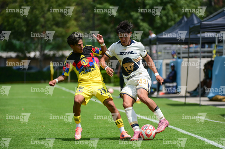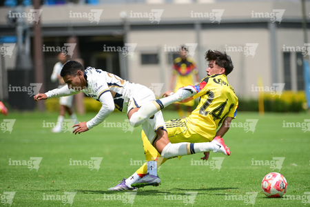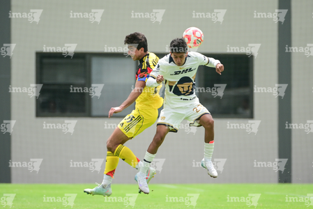 Ciudad de México, 27 de septiembre de 2025. Jared Salazar y Oscar Martínez, durante el partido correspondiente a la jornada 11 del torneo Apertura 2025 de la Liga BBVA MX categoría Sub19, entre las Águilas del América y los Pumas de la UNAM, realizado en Coapa. Foto: Imago7/ Alexis Chavez