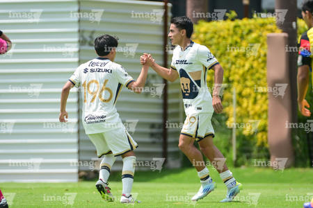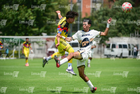 Ciudad de México, 27 de septiembre de 2025. Juan Briseño y Oscar Martínez, durante el partido correspondiente a la jornada 11 del torneo Apertura 2025 de la Liga BBVA MX categoría Sub19, entre las Águilas del América y los Pumas de la UNAM, realizado en Coapa. Foto: Imago7/ Alexis Chavez