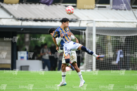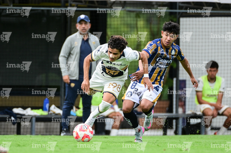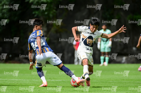 Ciudad de México, 22 de octubre de 2025. Johan Ocampo y Juan Hernández, durante el partido correspondiente a la jornada 14 del torneo Apertura 2025 de la Liga BBVA MX categoría Sub19, entre los Pumas de la UNAM y el Atlético de San Luis, realizado en Cantera. Foto: Imago7/ Alexis Chavez