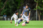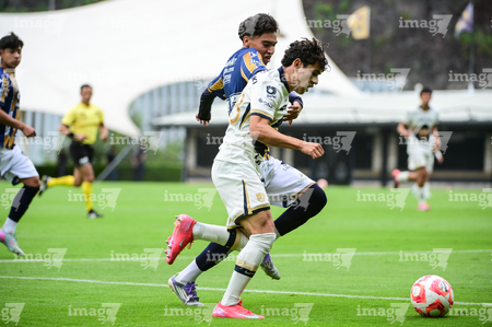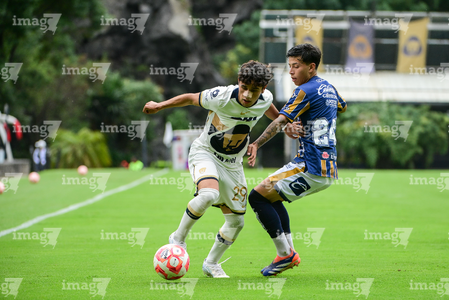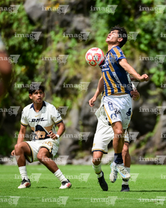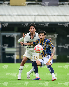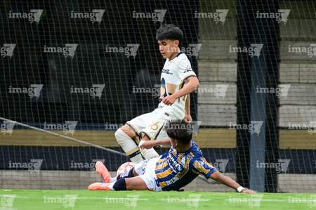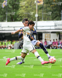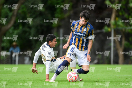 Ciudad de México, 22 de octubre de 2025. Johan Ocampo y Martín Gamboa, durante el partido correspondiente a la jornada 14 del torneo Apertura 2025 de la Liga BBVA MX categoría Sub19, entre los Pumas de la UNAM y el Atlético de San Luis, realizado en Cantera. Foto: Imago7/ Alexis Chavez